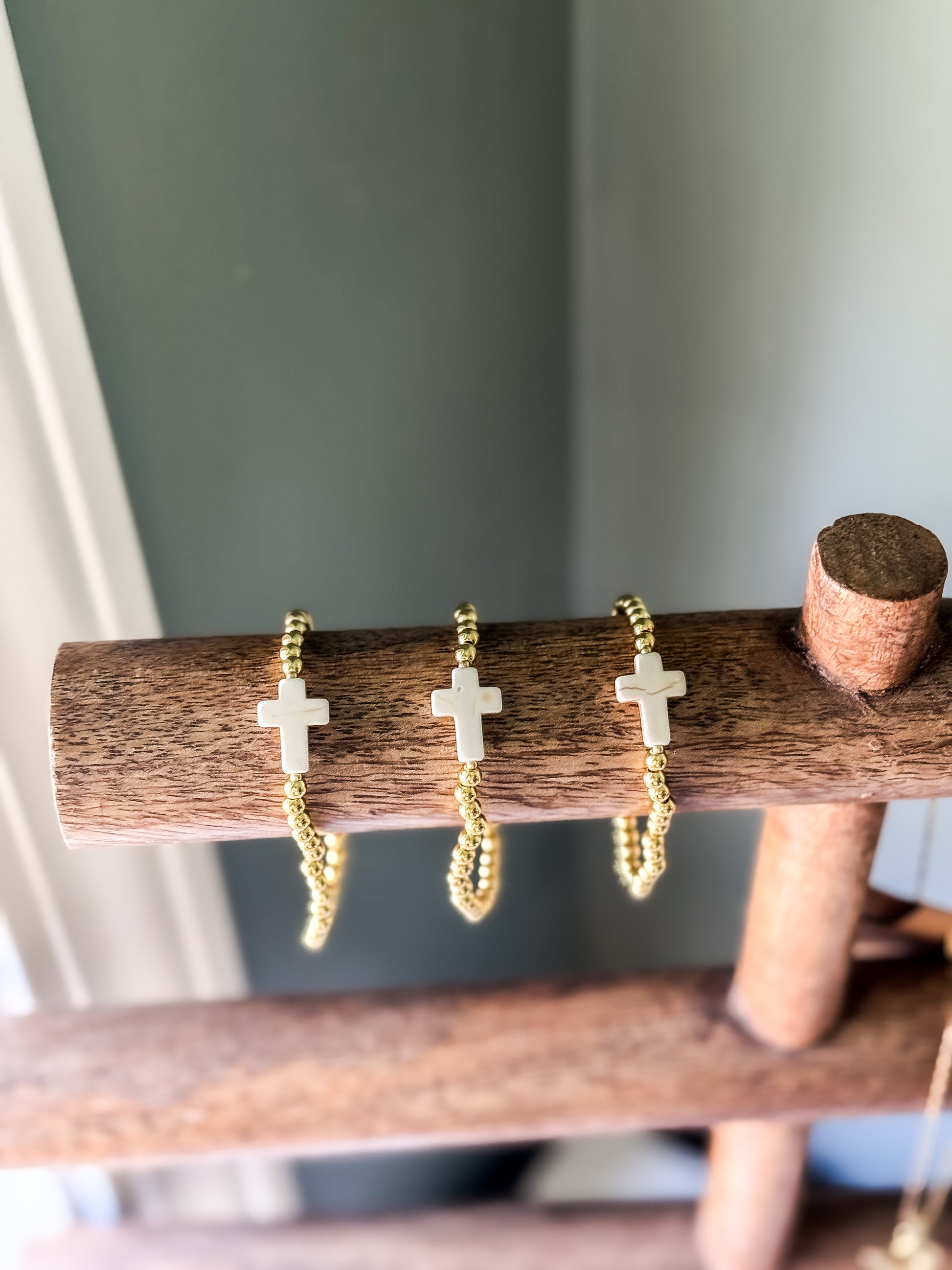 Gold filled gold bracelet with a creamy white cross. Standard size (6 -3/4) on high quality stretch cord.