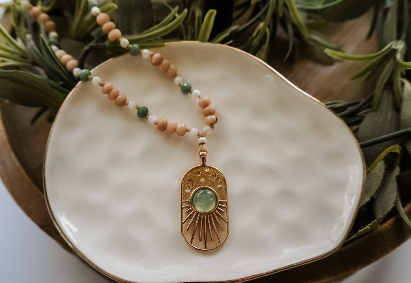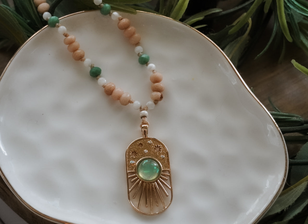 Desert Moon glows with desert dusk hues - muted peach, soft green, and golden light. A charm of balance and faith, made to remind you that calm and strength can coexist beneath the same sky.