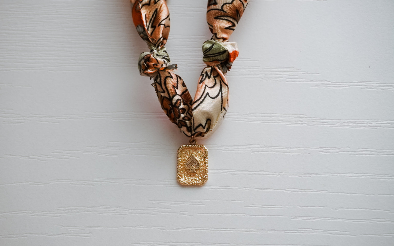The prairie Ace Silk Necklace features warm, bandana-patterned silk knotted by hand, finished with a textured gold spade charm. A nod to classic western playing card culture and cowgirl confidence.